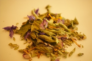 原材料名:クラリセージ(北海道)、マロウブルー(フランス)、ペパーミント(フランス)、レモンタイム(フランス)、ベルベーヌ(フランス)、カレンデュラ(フランス)